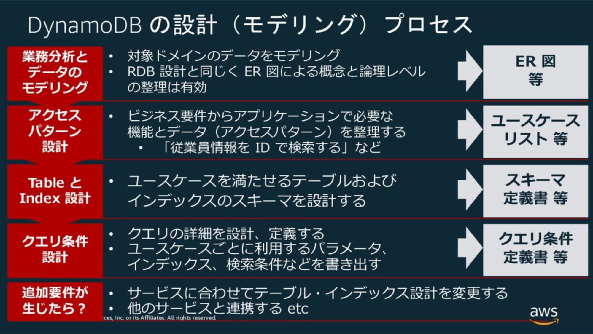 一方で、DynamoDBのデータモデリングの手順はRDBMSとは異なる。RDBMSであればデータ構造を正規化し、データ構造がビジネス要件を満たしていればクエリはSQL上の結合などで吸収できるため、柔軟性は高い。一方でDynamoDBは基本的に結合ができないため、どのようなデータアクセスが行われるかを分析し、最終的なデータ構造を決める必要がある。これは https://www.slideshare.net/slideshow/db-20190905/171086391 や DynamoDB の基礎と設計 / DynamoDB Design Practice - Speaker Deck などAWS公式ドキュメントでも述べられている。