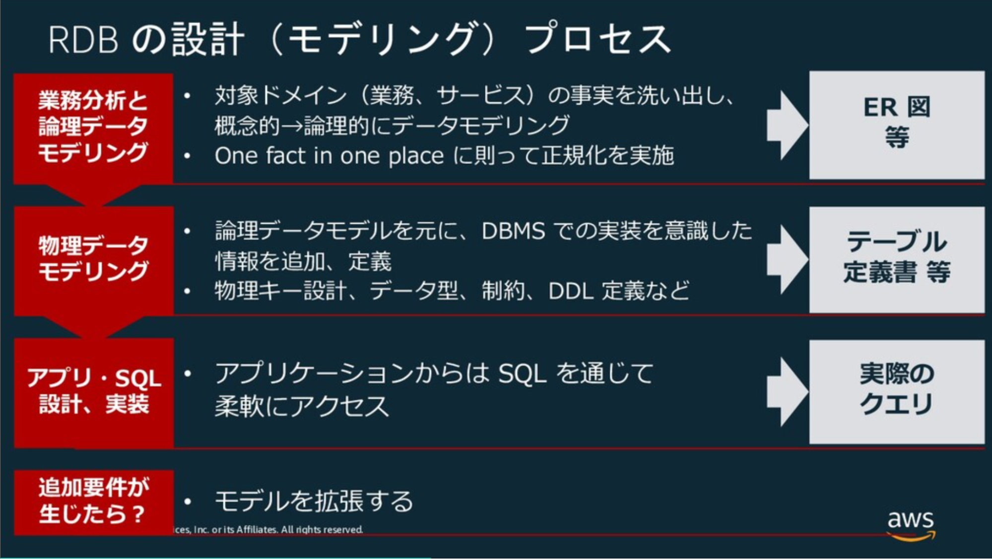 説明 | データの構造と正規化に重点を置いてデータモデルを設計する。その後でアプリケーション設計(クエリの作成)を行う | アプリケーションがデータをどのように利用するか、すなわち「アクセスパターン」の分析と、データモデルを同時に行う必要がある |