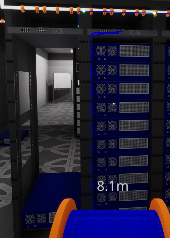 ゲーム内では、ケーブルリールからLANケーブルを引き出し、スイッチからサーバーへ1本ずつ繋いでいきます。